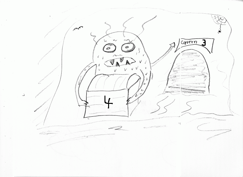 "You can have the 4 gold coins inside my treaure chest if you enter cavern 3 and come back out alive!"