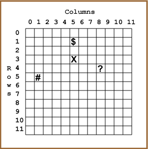 The position of each square is given by its column number and row number. For instance, the square with the # is column=1 row=5. The square with the $ is column=5 row=1. Notice that you have to be careful to get column and row in the right order.