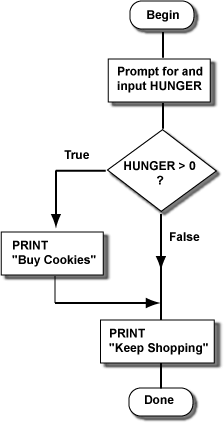 PRINT "Enter 1 if you are hungry; 0 if you are not" INPUT HUNGER ' IF HUNGER > 0 THEN PRINT "Buy Cookies" ' true branch END IF ' PRINT "Keep Shopping" ' this statement is always done END