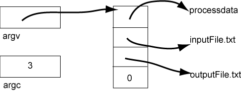 Here is how this works. When the user enters the above command line, the operating system creates the following data structure. The operating system does this automatically for all programs whether they ask for it or not.