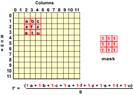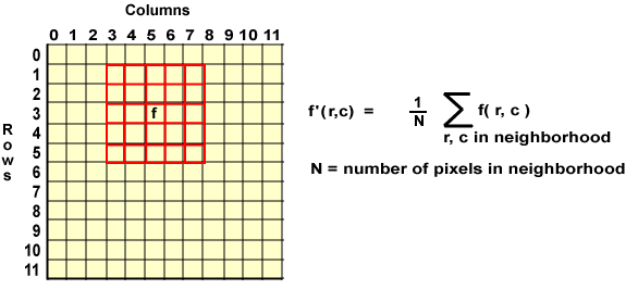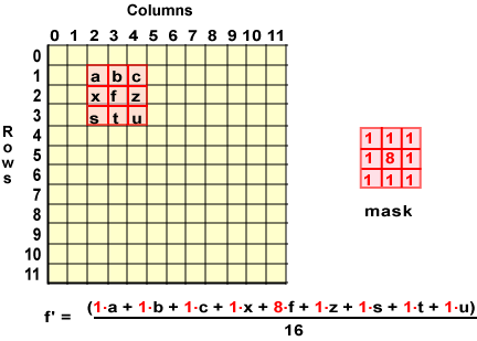 a 3x3 neighborhood. In general, each pixel f'(row, col) in the
