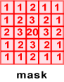 The central pixel, the middle ring of pixels and the outer ring have equal weight (20) in the weighted sum. The sum of weighted pixels now would be divided by 60, the sum of the weights in the mask.
