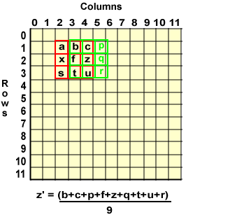The neighborhoods are overlapping; that is, each pixel of the original image has a neighborhood centered on it which determines the value of the corresponding pixel in the smoothed image. Think of the neighborhood as moving through the original image one pixel at a time. For example, the next pixel of the smoothed image is the average of the neighborhood centered at row 3 column 3: