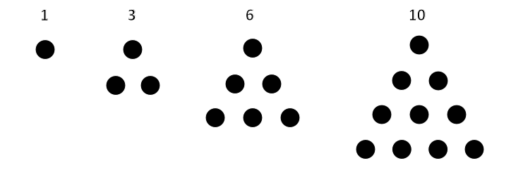 So 1, 4, 9, 16, 25, ... are square numbers. A triangle number is one where that many pebbles can be arranged into a triangle, with one pebble at the top, two in the next row, three in the third row, and so on.
