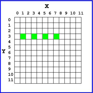 ' Setting pixels to color 2 (Green) ' and color 4 (Red) ' SCREEN 12 ' ' Change the pen color to Green ' COLOR 2 PSET ( 1, 3 ) ' set column 1 row 3 PSET ( 3, 3 ) ' set column 3 row 3 PSET ( 5, 3 ) ' set column 5 row 3 PSET ( 7, 3 ) ' set column 7 row 3 ' ' Change the pen color to Red ' COLOR 4 PSET ( 1, 5 ) ' set column 1 row 5 PSET ( 3, 5 ) ' set column 3 row 5 PSET ( 5, 5 ) ' set column 5 row 5 PSET ( 7, 5 ) ' set column 7 row 5 ' END