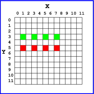 The program paints four green dots in row 3, then paints four red dots in row 5.