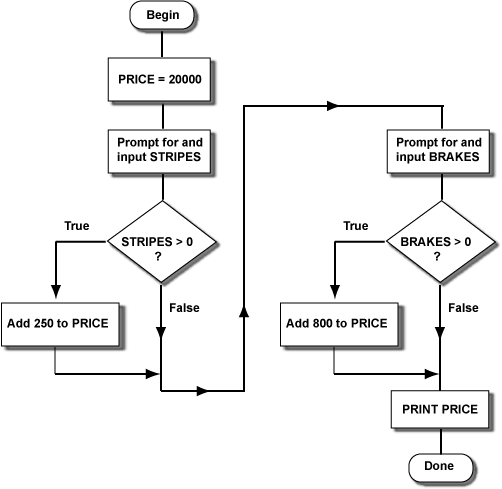 LET PRICE = 20000 ' PRINT "Type 1 if you want pin stripes, 0 if not" INPUT STRIPES ' IF STRIPES > 0 THEN LET PRICE = PRICE + 250 END IF ' PRINT "Type 1 if you want anti-lock brakes, 0 if not" INPUT BRAKES ' IF BRAKES > 0 THEN LET PRICE = PRICE + 800 END IF ' PRINT "Final price:", PRICE END