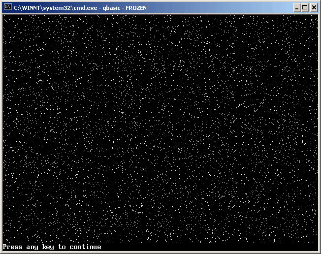 SCREEN 12 FOR DOT = 1 to 10000 LET X = INT( 640*RND ) ' pick a random column 0 to 639 LET Y = INT( 480*RND ) ' pick a random row 0 to 479 PSET( X, Y) ' draw the random point NEXT DOT ' END